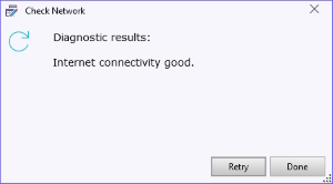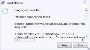 There is a network diagnosis window built into Rons Place Software products that can help by giving more information about the connection issue. Diagnosis can be started by our customers by using the 'Application/Check Online/Check Network' ribbon or menu. If all goes well, the message below will be shown.