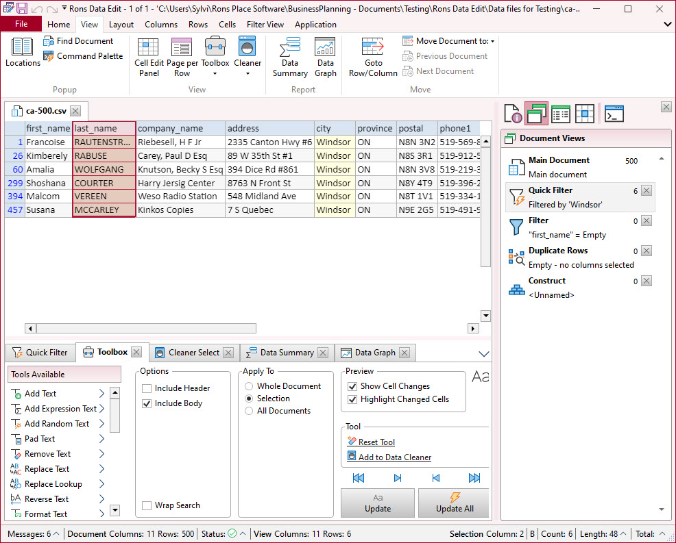 The tool panels allow to display and perform advanced editing actions on the main document or on a filtered view. The visualization panels provide settings to summarize the data and display it in the form of graphs.