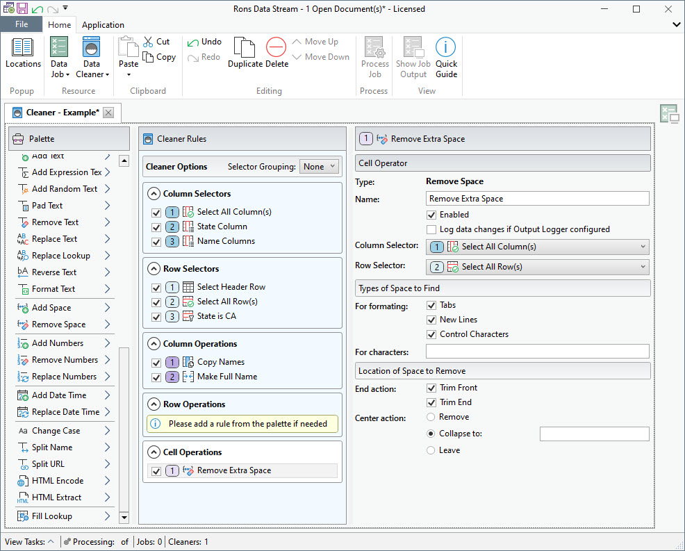 A Cleaner defines the editing operations to be processed through the data files when running the Job. One or more cleaners may be saved and added to a Job setting in any order of execution.